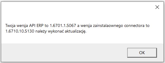 updateConnector– uruchamia w tle sprawdzenie i aktualizację (jeżeli dostępna) connectoraupdateInstaller– uruchamia w tle sprawdzenie i aktualizację (jeżeli dostępna) instalatoraupdateConnectorIfErpVersionChanged– uruchamia w tle sprawdzenie czy zmieniła się wersja ERP i przeprowadza aktualizację connectora tylko w przypadku zmiany wersji ERP
