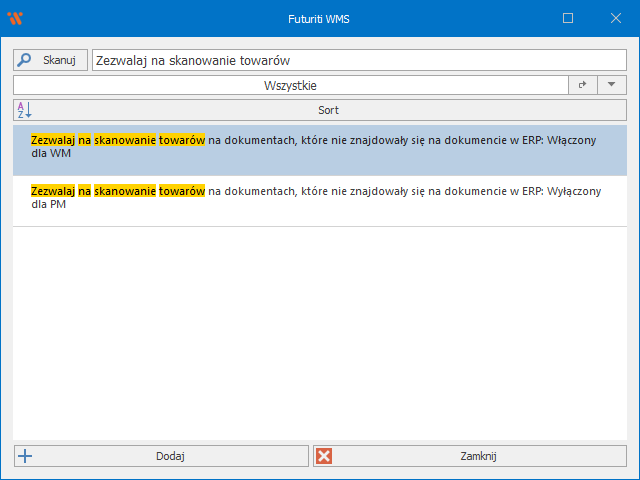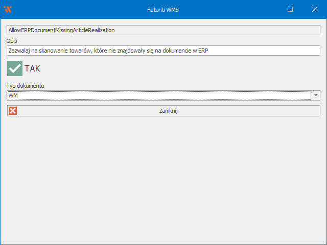 Wyszukaj odpowiednie wpisy za pomocą kodu „AllowERPDocumentMissingArticleRealization” lub frazy „Zezwalaj na skanowanie towarów”