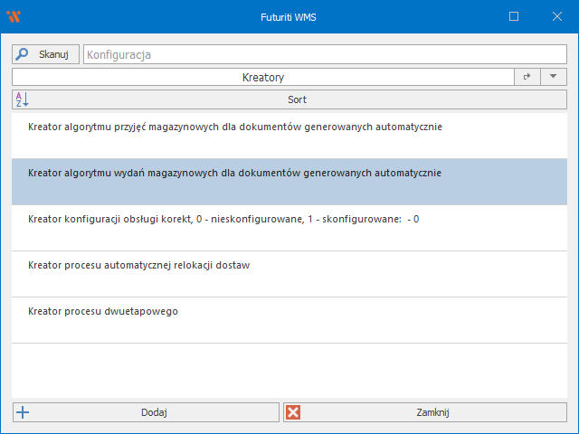 Aby edytować algorytm wydań, należy przejść do: Menu główneOpcjeKonfiguracjaKreatory.