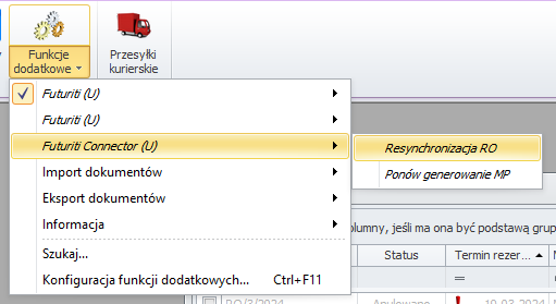 Te akcje są dostępne po otwarciu odpowiedniej listy w Optimie, pod przyciskiem: Funkcje dodatkowe → Futuriti Connector.