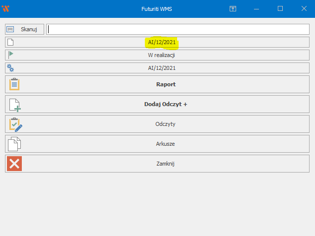 - Po zakończeniu realizacji wszystkich odczytów (zeskanowania wszystkich towarów z każdej lokalizacji), zamknij inwentaryzację poprzez kliknięcie w górny przycisk z numerem dokumentu „AI/…/…” lub przejście do zakładki „Menu” -> „Dokumenty” -> „AI/…/…”. Na koniec użyj przycisk „Zakończ”.