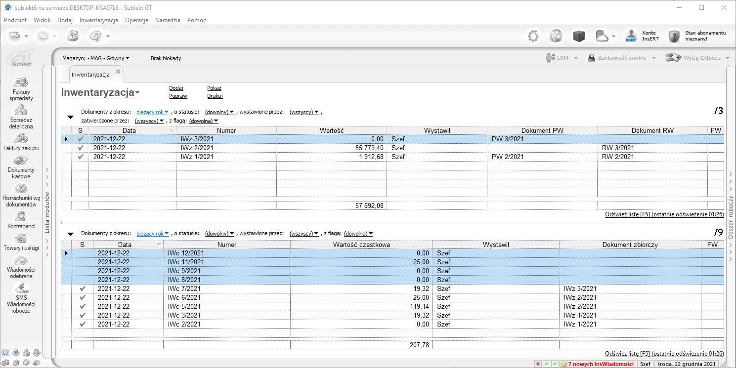 - Po zakończeniu inwentaryzacji w WMS, przejdź do ERP SUBIEKT GT do zakładki INWENTARYZACJA oraz na podstawie stworzonego dokumentu lub dokumentów IWc, użyj przycisku WYPISZ ZBIORCZĄ.
