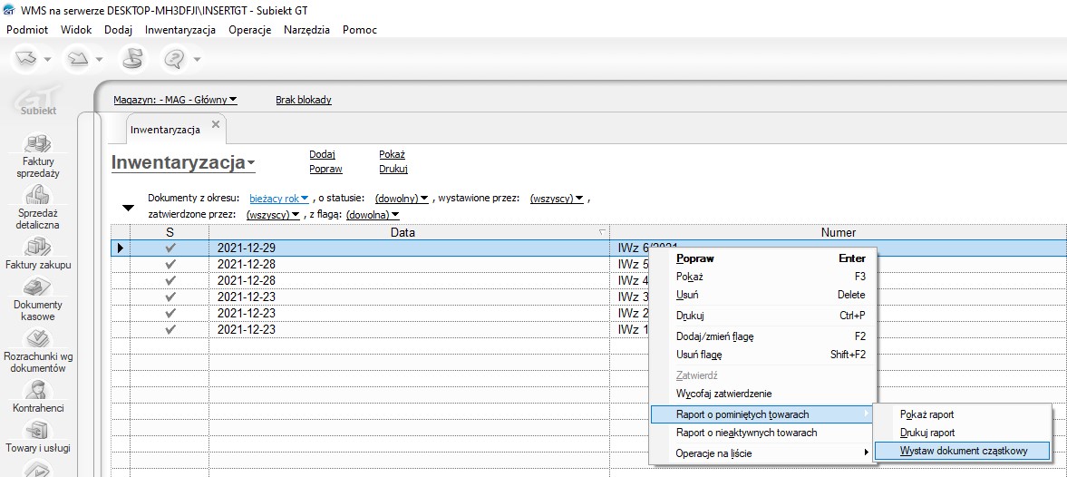 - W przypadku pominiętych produktów (produkty, które nie występują już na magazunie a w ERP SUBIEKT GT posiadają stany) należy z dokumentu IWz wystawić RAPORT O POMINIĘTYCH TOWARACH, który wygeneruje na nie rozchód.