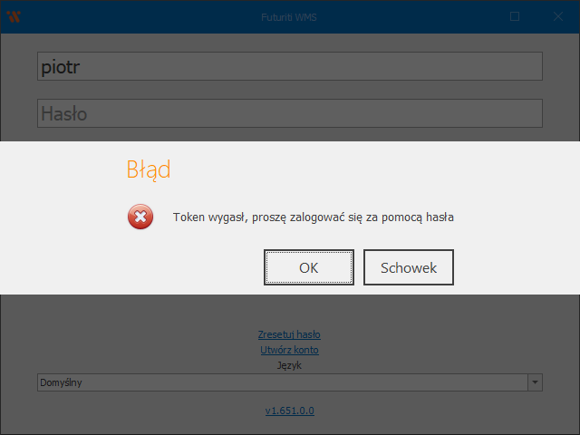 Jeśli użytkownik nie logował się do WMS przez okres 14 dni lub po upływie 30 dni, konto wymagać będzie ponownego uwierzytelnienia za pomocą hasła do konta Futuriti