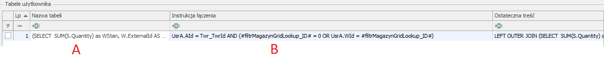 W „Tabele użytkownika” w kolumnie „Nazwa tabeli”  [A] wpisujemy podzapytanie: