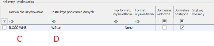 W „Kolumny użytkownika” w celu wyświetlenia podajemy „Nazwa dla użytkownika” [C] dowolny tekst wyświetlany na kolumnie np „Stan WMS”. W kolumnie „Instrukcja pobierania danych” [D] wpisujemy WStan