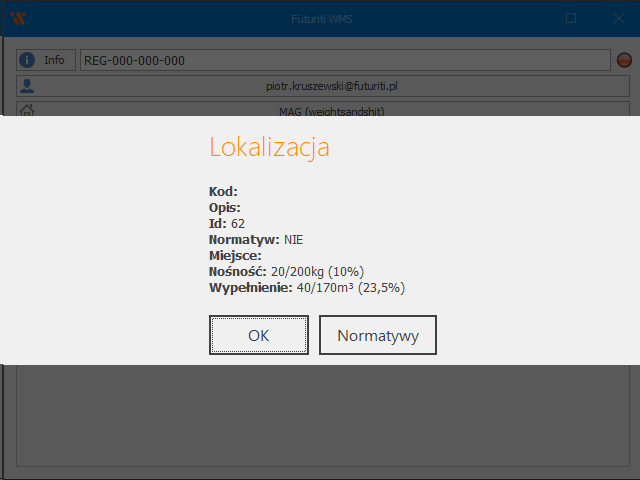 Aby sprawdzić konkretne miejsce, wystarczy zeskanować numer lokalizacji w trybie info w głównym menu WMS. Na ekranie pojawią się informacje o nośności oraz stopniu zapełnienia danej lokalizacji.