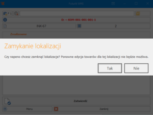 Przed zamknięciem inwentaryzacji, sprawdź czy wszystkie otwarte lokalizacje zostały zamknięte!! Jeżeli inwentaryzacja zostanie zamknięta a lokalizacja otwarta, dokumenty pomiędzy ERP a WMS nie będą się synchronizowały.