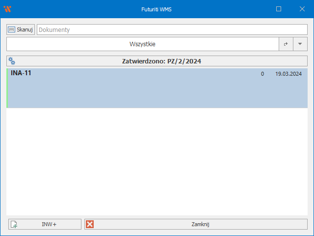 - Inwentaryzacja została zakończona. W programie ERP Optima widoczne są już nowe dokumenty przyjęć oraz rozchodów wewnętrznych (PWAI oraz RWAI, zależnie od konfiguracji programu mogą wymagać zatwierdzenia poprzez wyciągnięcie ich z bufora), które wyrównały stany magazynowe na zeskanowane produkty (Nie wymagają wykonania akcji w Futuriti WMS). Możesz kontynuować codzienną pracę.