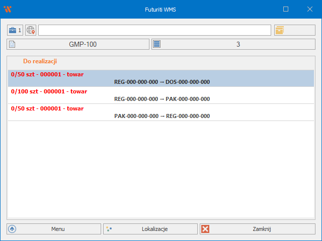 Każdy następny skan towaru 000001 będzie realizował konkretną pozycję. Zapamiętana lokalizacja docelowa zostanie wyczyszczona w momencie pełnego zrealizowania pozycji lub poprzez kliknięcie w oznaczoną belkę