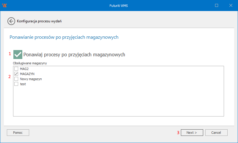 Jednym z kroków kreatora jest konfiguracja restartu procesów w momencie przyjęcia magazynowego