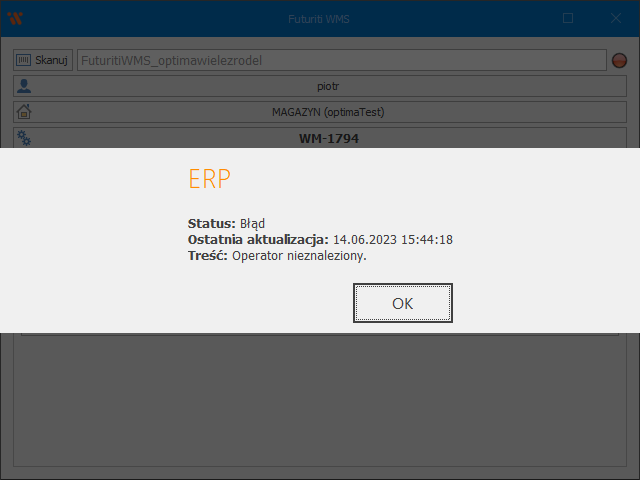 Od wersji 1.682 WMS w menu głównym wyświetlany jest status Futuriti Connector, informujący o ewentualnych problemach z logowaniem do ERP lub niespełnionych wymaganiach konfiguracyjnych