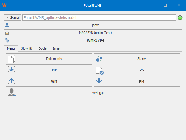 Jeśli aktualna instalacja WMS integruje się z Futuriti Connector, w prawym górnym rogu aplikacji widoczny będzie wskaźnik statusu połączenia