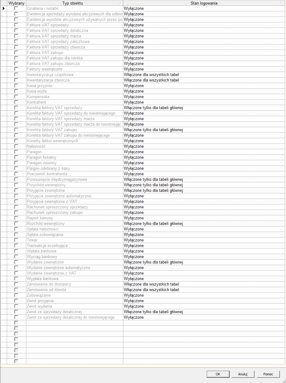 - Szpieg włączony przynajmniej dla tabeli głównej dla obiektów: