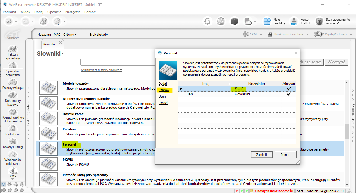 Wybrać opcję „Personel” i zaznaczyć użytkownika, którego chcemy poprawić.
