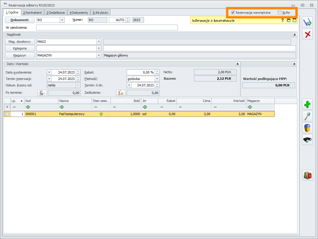 • [Operator] W Comarch Optima, utwórz nowy dokument RO, zaznacz rezerwację wewnętrzną, ustaw magazyn docelowy (Optima wymaga aby były to różne magazyny) oraz uzupełnij pozostałe pola na dokumencie