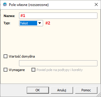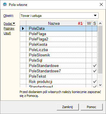 | ValueText | [tw__Towar].[tw_Pola1…8][#3] | Dla pola standardowego. |