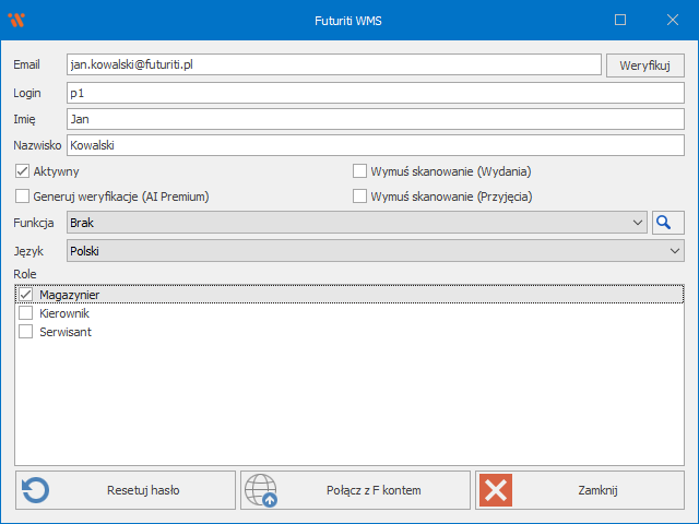 • Email → Zarejestrowany w Futuriti adres e-mail użytkownika