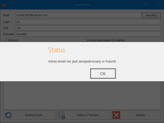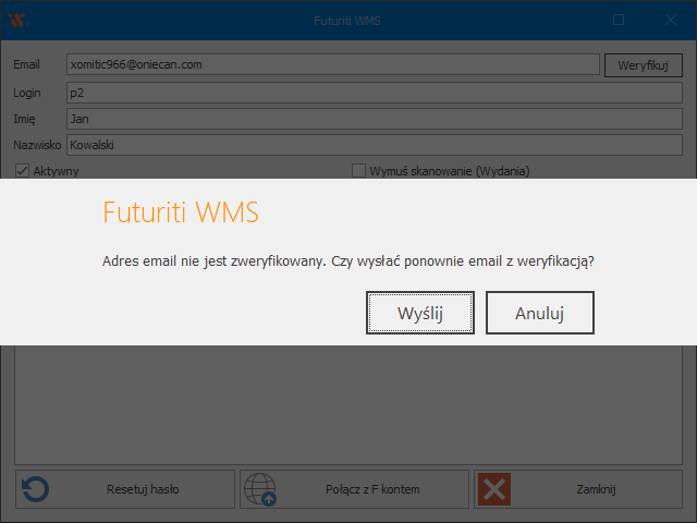 • Weryfikuj → Przeprowadź weryfikację adresu email, proces sprawdzi czy adres jest zarejestrowany oraz potwierdzony w Futuriti. Jeśli adres nie jest potwierdzony, z poziomu komunikatu można ponownie wysłać mail weryfikacyjny