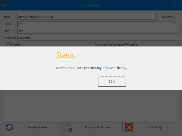 Możliwe jest zweryfikowanie podanego adresu e-mail przed zapisaniem lub połączeniem konta z Futuriti za pomocą przycisku Weryfikuj znajdującego się obok pola Email