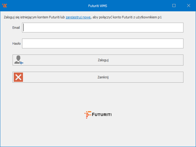 Jeśli nie posiadasz konta Futuriti możesz je utworzyć klikając link Zarejestruj nowe na górze formatki. Zarejestruj konto, potwierdź adres email i powróć do WMS