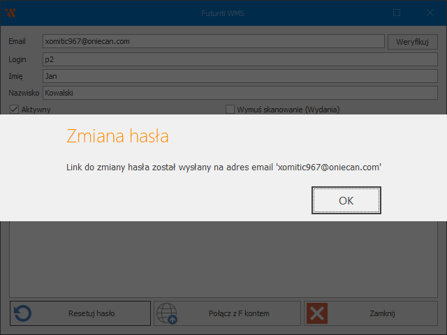 Jeśli adres e-mail nie będzie prawidłowy uniemożliwi to zalogowanie na konto WMS i wymagać będzie utworzenia nowego konta, po zapisaniu zmiana adresu e-mail nie jest możliwa!