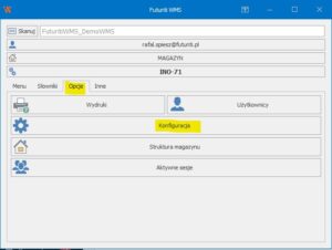 1. Otwórz aplikację Futuriti WMS, przejdź do zakładki „Opcje”->”Konfiguracja”