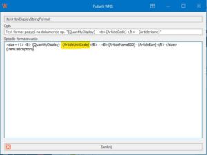 3. Dodajemy {ArticleUnitCode} (bardzo ważne jest użycie nawiasów klamrowych)