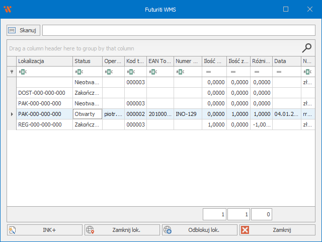 W przykładzie powyżej lokalizacja PAK-000-000-000 została otwarta przypadkowo, odczyt został wcześniej w pełni zrealizowany.